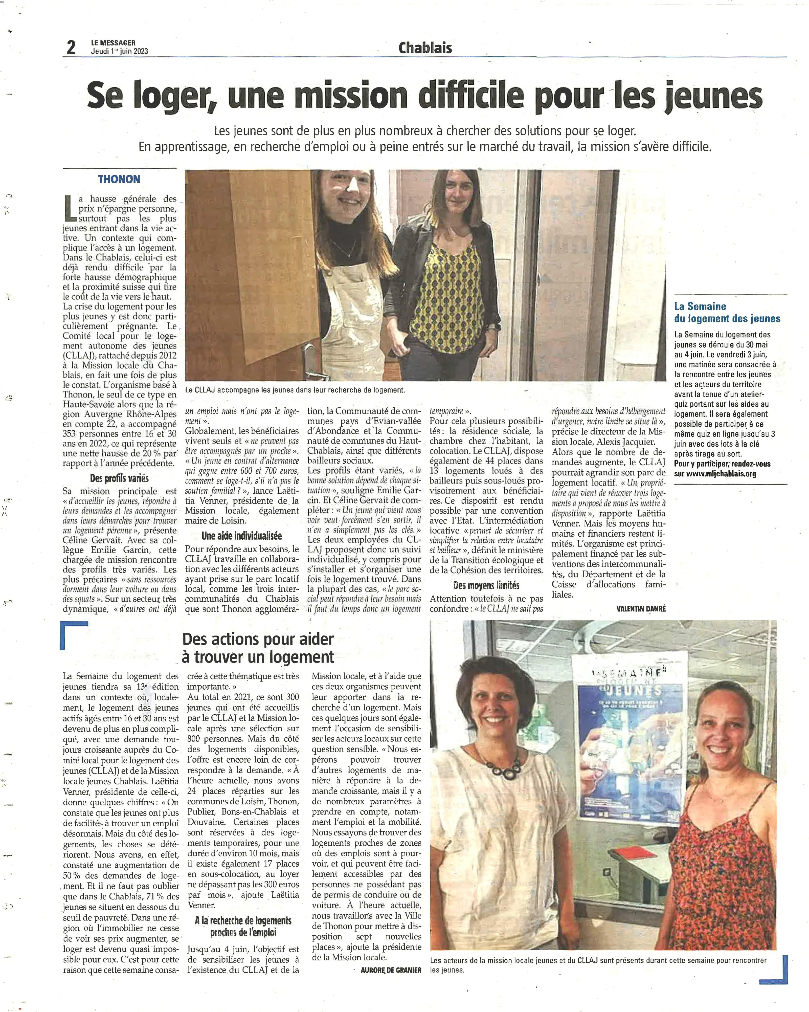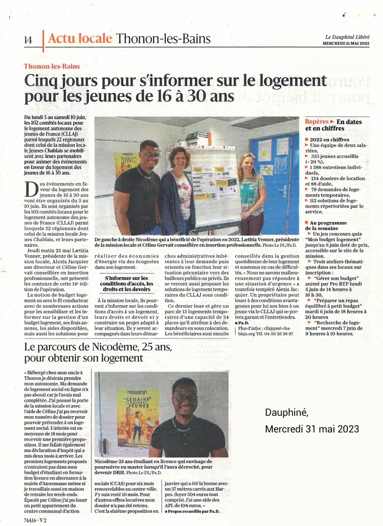 Suite à notre conférence de presse du 25 mai, le "Dauphiné Libéré" a sorti un article pleine page sur la Semaine du logement des jeunes en date du mercredi 31 mai.
