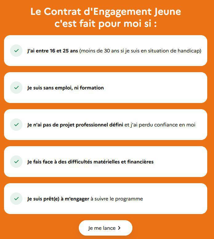 Le Contrat d’Engagement Jeune est un dispositif de 6 à 12 mois* qui s’adresse aux jeunes de 16 à 25 ans qui ne sont pas scolarisé(e), ni en formation, ni en emploi, ni en stage et qui souhaitent s’engager activement dans un parcours vers l’emploi.